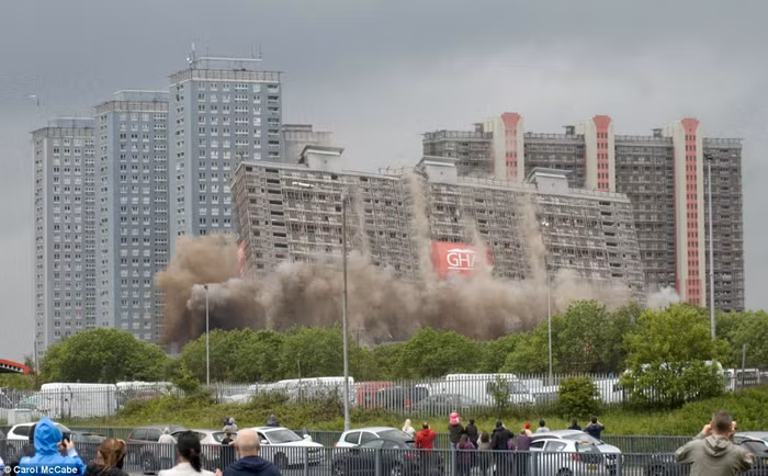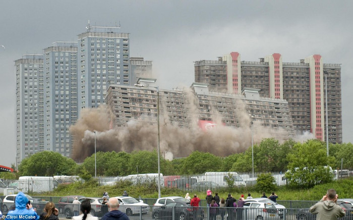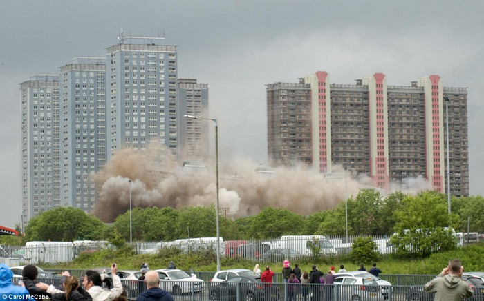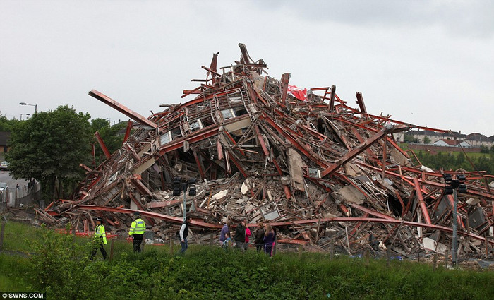 | Toà chung cư Red Road ở Glasgow, Scotland đã sụp đổ trong chốc lát sau tiếng nổ mạnh cùng với tiếng động chói tai của bê tông và thép rơi xuống. Chỉ trong 5 giây, một công trình kiến trúc khổng lồ đã từng là toà chung cư cao nhất ở châu Âu chỉ còn lại là đống đổ nát. |