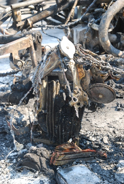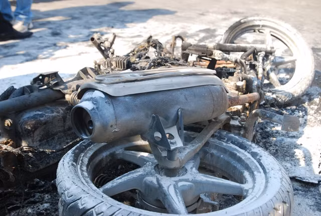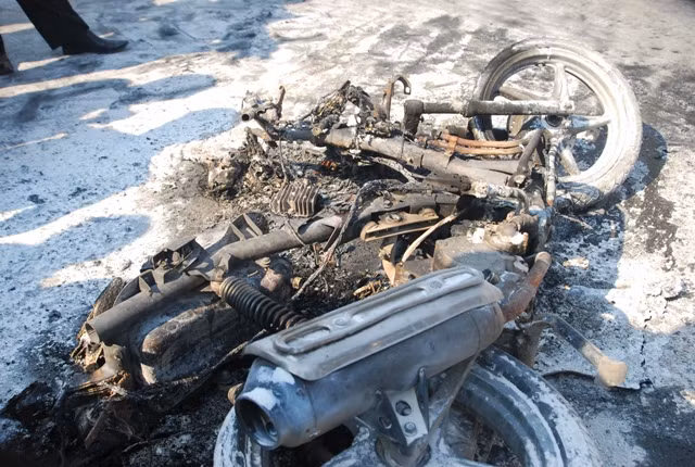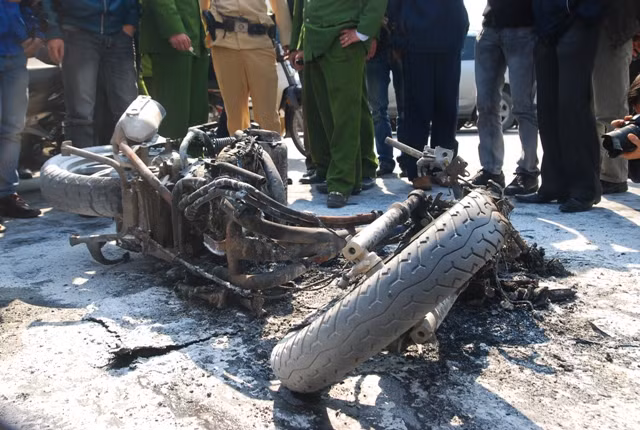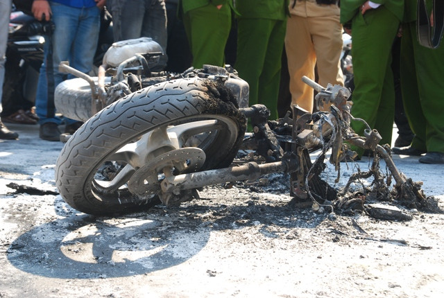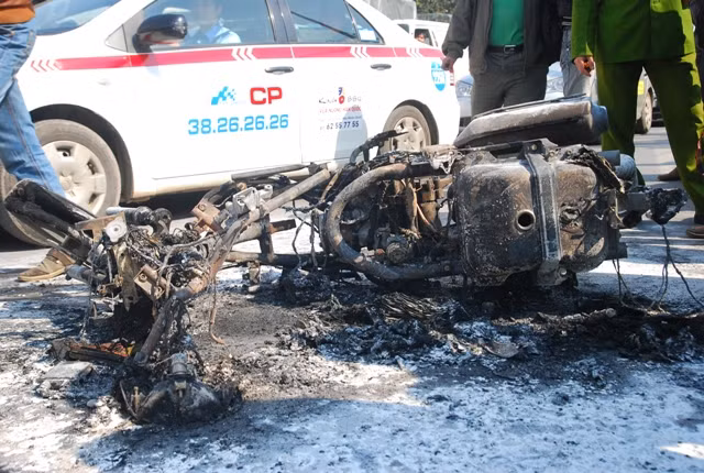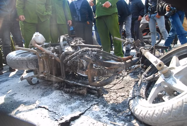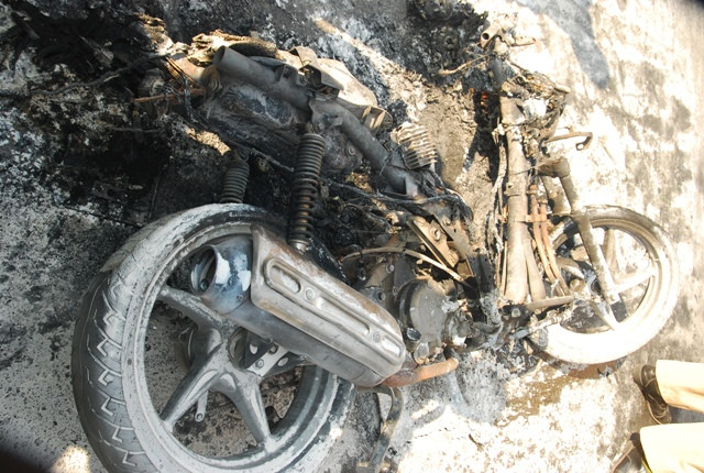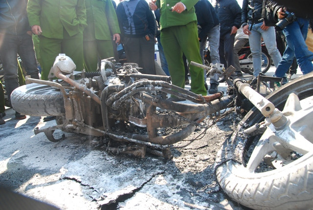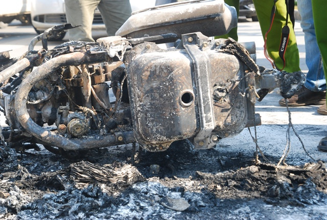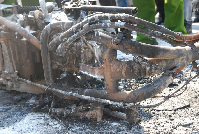 Chiếc xe bị cháy hết phần vỏ ngoài, chơ chọi lại chiếc khung xe và 2 bánh xe.