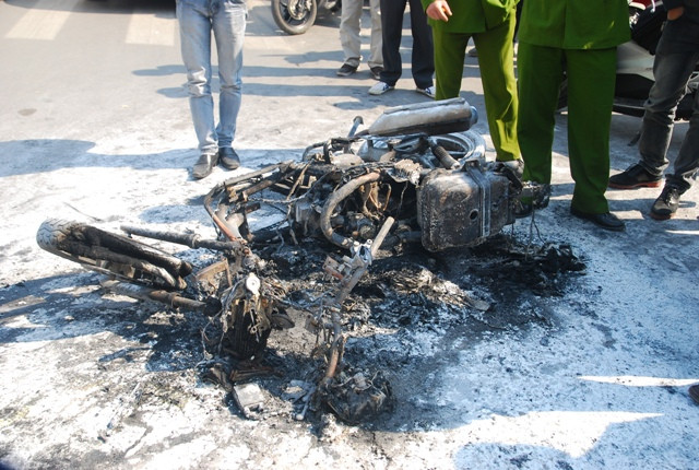 Trưa nay, ngay ngã tư khách sạn Daewo, hướng từ Kim Mã – Cầu Giấy, một chiếc xe máy tay ga Sym Shark, màu trắng đã bốc cháy. Theo như lới nhân chứng là chú Ngô Trọng Luyến kể lại: “ Khi sảy ra vụ việc tôi đang đứng bên đường thì thấy chiếc máy Sym Shark đổ xuống đường, tiếng đổ xe rất to. Ngay phía trước xe máy có 1 chiếc ô tô màu đen cũng dừng lại, người chủ chiếc xe máy chạy ra chỗ chiếc ô tô nói chuyện, sau đó quay lại dựng và lên xe để đi, vừa ngồi lên xe thì chiếc xe bắt đầu cháy, cháy từ mặt đường lên trên cao. Cháy tầm khoảng 15 phút thì chiếc xe đã bị rụi thành than, chỉ còn lại chiếc khung xe”.