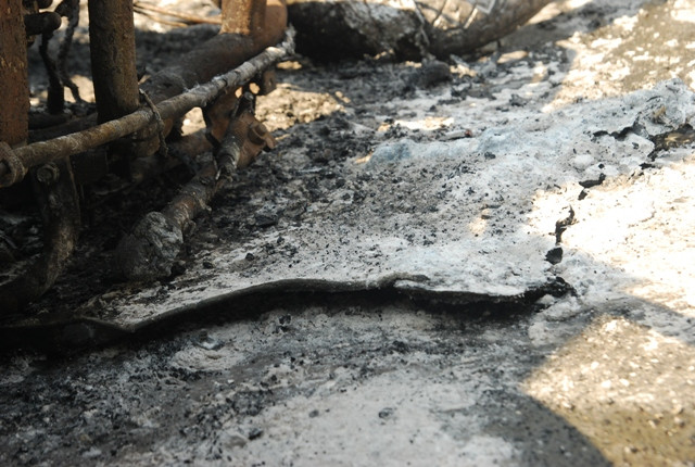 16:Vỏ xe đã cháy thành những mảng nhựa nằm dưới đường