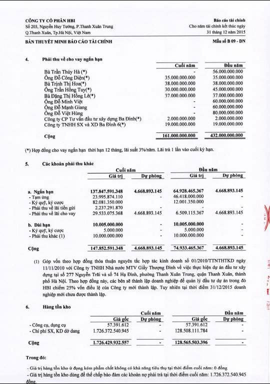 Mục đích sử dụng tiền vay được ghi rõ trong hợp đồng là: Tài trợ dự án tổ hợp văn phòng, nhà ở cao cấp kết hợp dịch vụ thương mại HBI tại 2013 Nguyễn Huy Tưởng (Thanh Xuân, Hà Nội). Thời gian ân hạn là 23 tháng kể từ thời điểm giải ngân khoản vay đầu tiên. Tài sản thế chấp là toàn bộ tài sản thuộc dự án đã hình thành và hình thành trong tương lai. Lãi suất áp dụng tại thời điểm ngày 31/12/2015 là 8,95%.