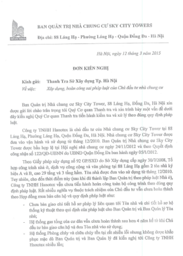 | Đơn kiến nghị của ông Đặng Trọng Hiếu, Trưởng ban quản trị tòa nhà gửi các cơ quan chức năng xem xét giải quyết. |