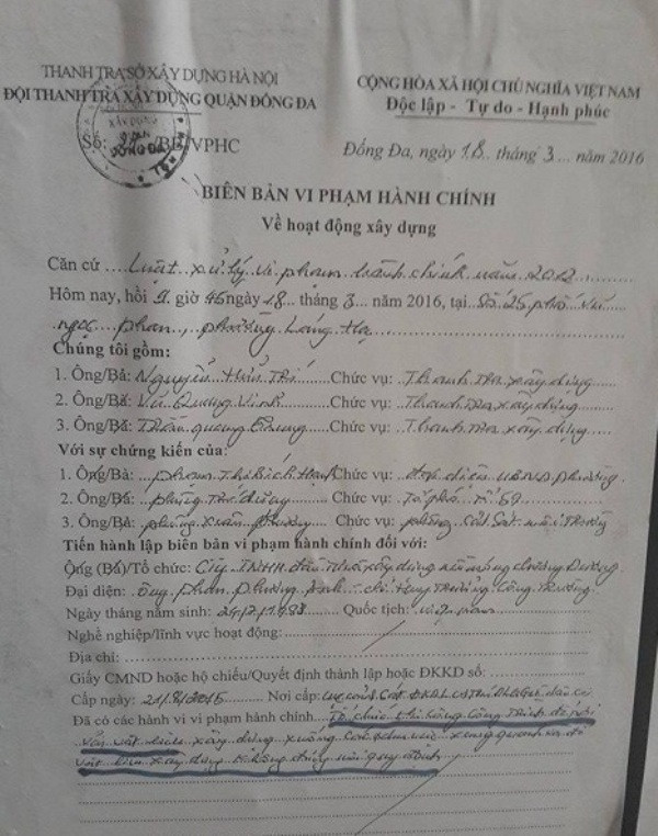 Cùng ngày, Đội Thanh tra xây dựng quận Đống Đa cũng lập Biên bản vi phạm hành chính về hoạt động xây dựng số 26/BB-VPHC đối với Công ty Mekong và Biên bản số 27/BB-VPHC đối với Công ty Chương Dương.