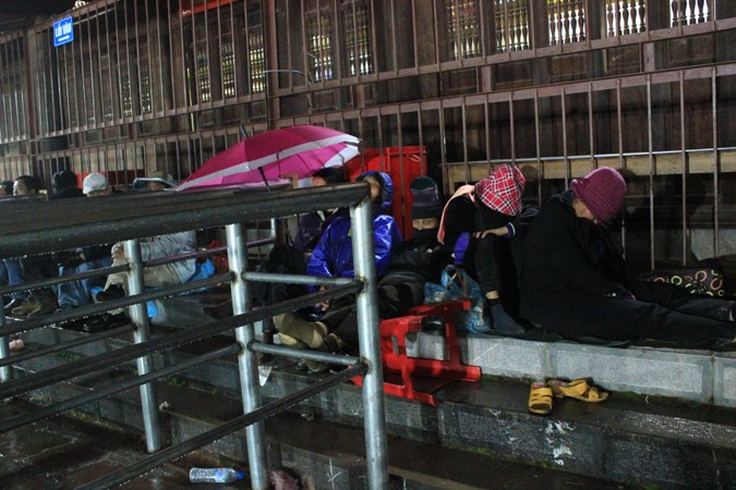 | Tranh thủ có chiếc ghế đá, hai thanh niên này ngủ một giấc chờ trời sáng... |