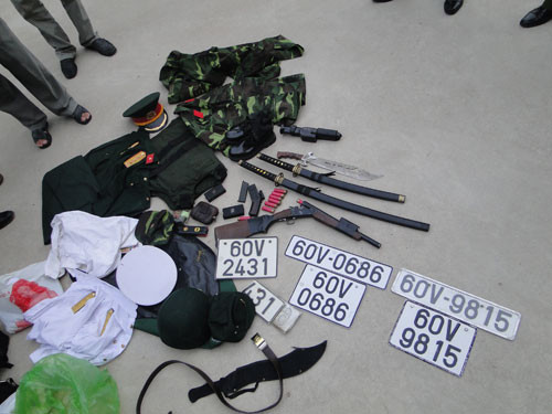 Khám xét nơi ở của Phụng và Điệp, công an thu giữ 1 khẩu súng ngắn colt 45 (bắn đạn bi), 1 mô tô biển số 60L8-5354, 1 ô tô Zace biển số 60V-8598, 1 súng kíp bắn đạn chùm, 1 băng đạn bi, 2 thanh kiếm, 1 mã tấu, 7 viên đạn chùm, 8 roi điện, 2 dụng cụ kích điện, 1 khẩu súng điện, 2 bộ quần áo quân đội, 2 mũ sĩ quan quân đội cùng cấp hàm thượng úy, trung úy, 1 giấy chứng nhận quân nhân, nhiều giấy phép lái xe, giấy đăng ký xe mang nhiều tên họ khác nhau, 5 bộ biển số ô tô, 1 đôi găng tay, 1 cuộn băng keo, 1 sợi dây dù.