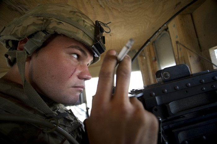 | Một binh sỹ Mỹ vừa lau, chùi khẩu súng máy 12,7 mm trong chốt gác của mình. |