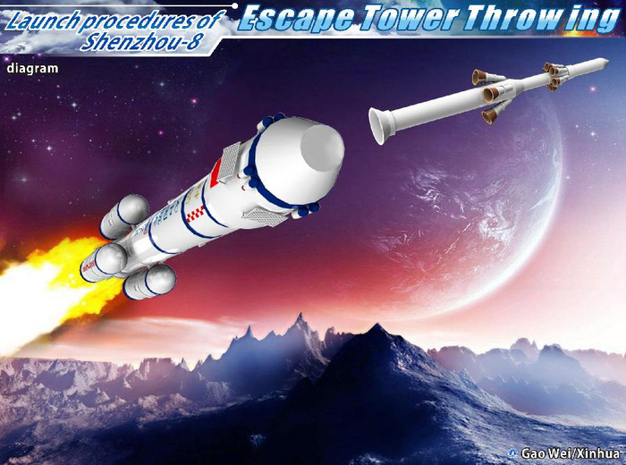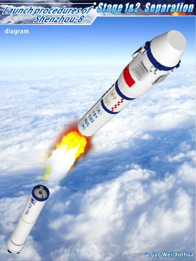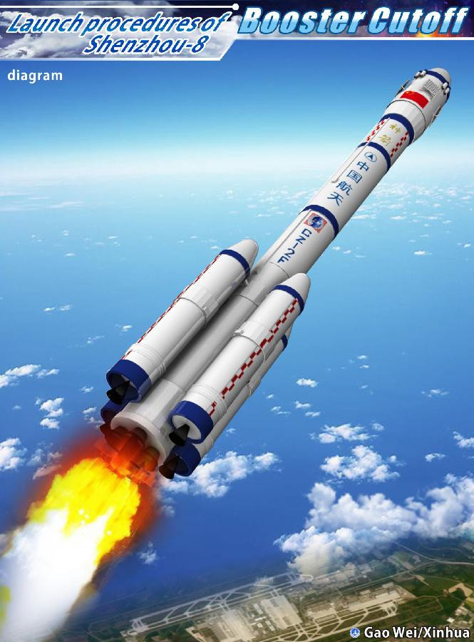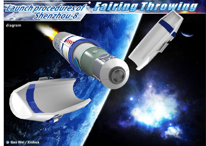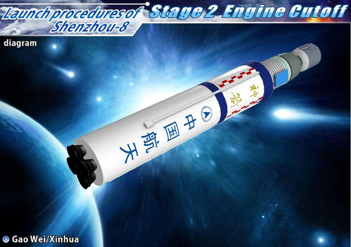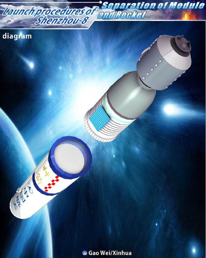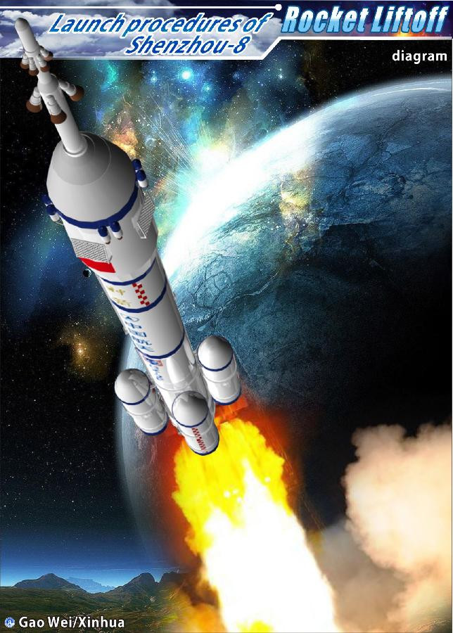 | Tàu Thần Châu 8 (Shenzhou VIII) đã rời bệ phóng tại Trung tâm phóng vệ tinh Tửu Tuyền, tỉnh Cam Túc (ở vùng sa mạc Gobi thuộc tây bắc Trung Quốc) vào lúc 5h58 sáng 1.11 theo giờ địa phương. |