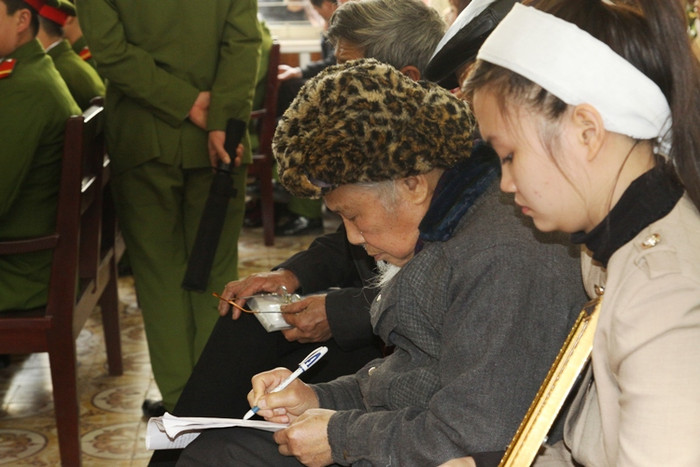 Ông Tín - ông nội cháu Bích ngồi lặng nghe đọc cáo trạng, đôi tay đã nhăn nheo, thỉnh thoảng lại run run đưa lên gạt nước mắt...