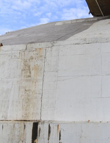 | Nhiều vết nứt chằng chịt ở trụ tháp gần giữa cầu... |