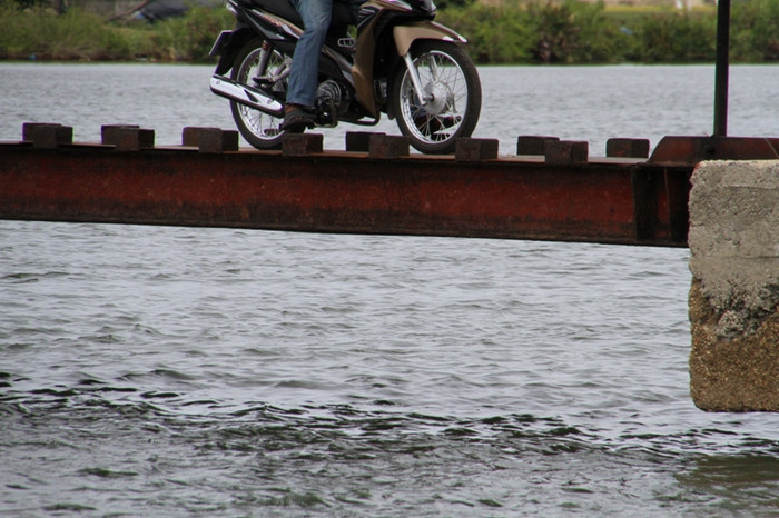 | Đoạn giữa cầu là nơi thông thuyền qua lại nên không có lan can bảo vệ, rất nguy hiểm. Nếu người đi xe máy, xe đạp mà không thăng bằng tốt thì có thể ngã bất cứ lúc nào. |