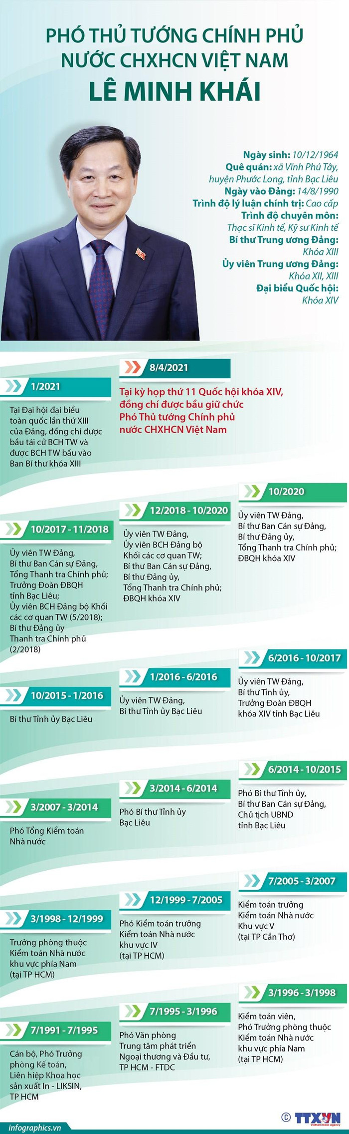 Tân Phó Thủ tướng Chính phủ Lê Minh Khái từng qua nhiều vị trí công tác, là Phó Bí thư Tỉnh ủy, Bí thư Ban Cán sự đảng, Chủ tịch Ủy ban Nhân dân tỉnh, Bí thư Tỉnh ủy, Trưởng Đoàn đại biểu Quốc hội khóa XIV tỉnh Bạc Liêu.