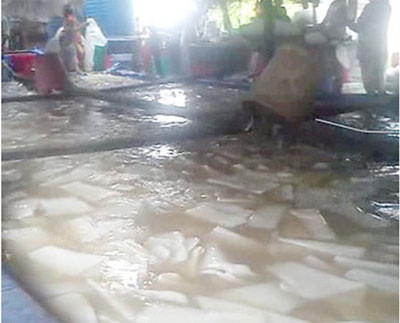 Mới 6g ngày 14-4 khu xưởng rộng gần 400m2 nằm mép bờ sông Bến Tre của bà Bảy đã vang rền tiếng máy nhịp lạch xạch. Kế hai bước chân, bốn chiếc môtơ rửa thạch mốc đen quay ù ù. Tuy mới đầu sáng nhưng khắp xưởng đã xộc lên mùi hôi thối của đống thạch ép để quá hai ngày nằm chất thành đống. Gần đó, ở khu cắt thạch, một nhóm 15 công nhân tất bật đưa thạch vào xắt.