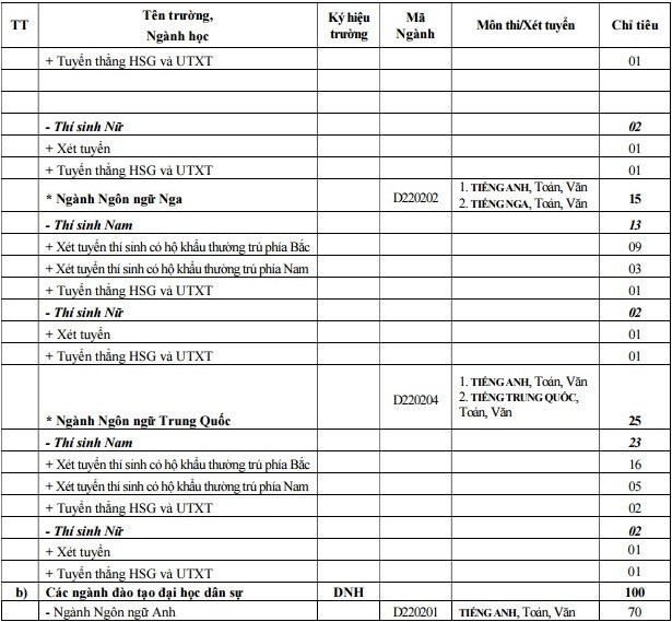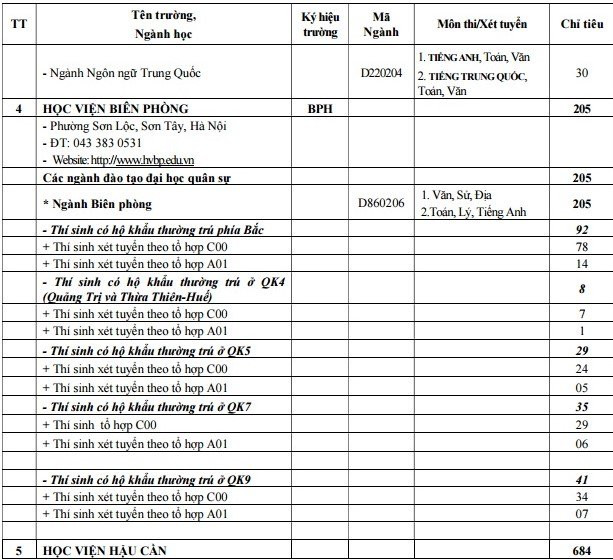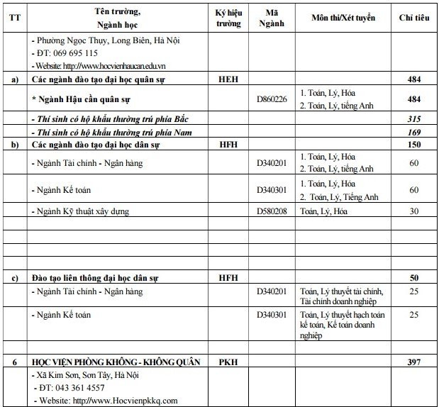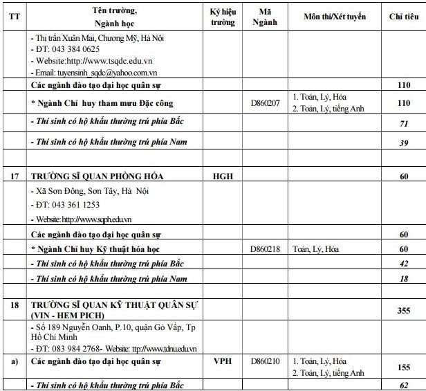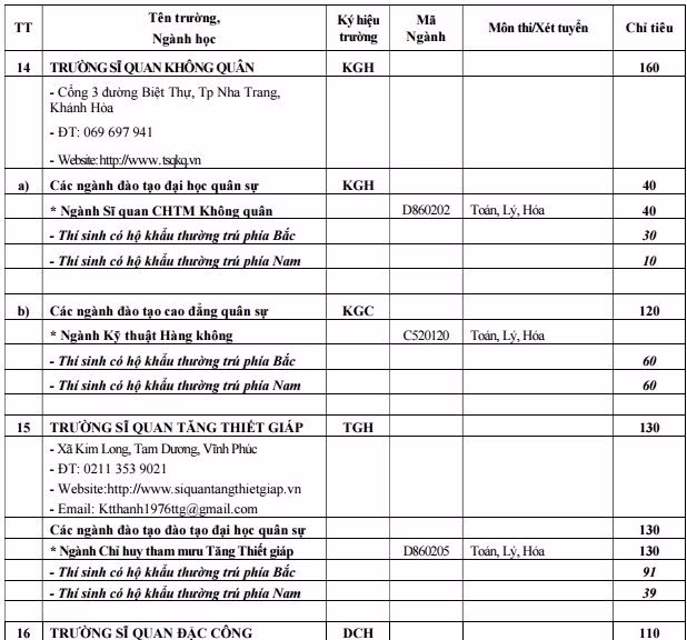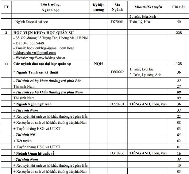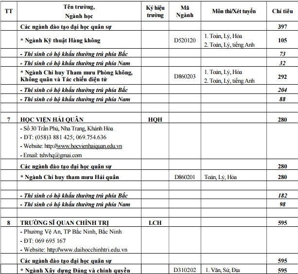 Thông tin chi tiết về ngành và chỉ tiêu tuyển sinh của các trường thuộc khối quân đội như sau: