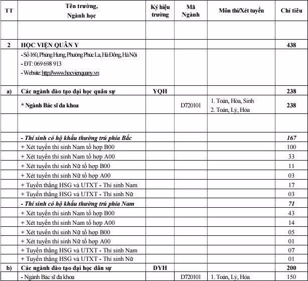 Học viện Quân y tuyển thẳng và ưu tiên xét tuyển 17 chỉ tiêu nam, 3 chỉ tiêu nữ ở phía Bắc; 7 chỉ tiêu nam, một chỉ tiêu nữ ở phía Nam.