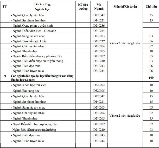 Đại học Văn hóa Nghệ thuật Quân đội tuyển 25 chỉ tiêu hệ cao đẳng quân sự cho ngành Văn thư lưu trữ. Đối với hệ dân sự, trường tuyển 120 chỉ tiêu cho các ngành đào tạo đại học, 100 chỉ tiêu cho các ngành đào tạo đại học liên thông từ cao đẳng lên đại học (2 năm) và 50 chỉ tiêu cho các ngành đào tạo cao đẳng dân sự (3 năm).