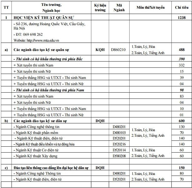 Năm nay, Học viện Kỹ thuật Quân sự tuyển 1.238 chỉ tiêu. Trong đó, 488 chỉ tiêu dành cho khối quân sự, 600 chỉ tiêu cho các ngành đào tạo kỹ sư dân sự và 150 chỉ tiêu liên thông hệ dân sự. Trường xét tuyển dựa trên tổ hợp môn A00 (Toán, Lý, Hóa) và A01 (Toán, Lý, Tiếng Anh).