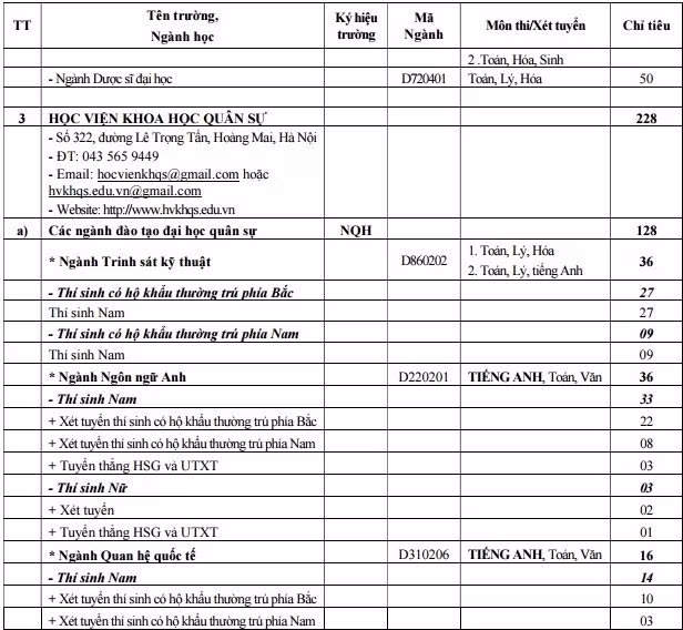 Học viện Khoa học Quân sự tuyển 128 chỉ tiêu hệ quân sự cho các ngành Trinh sát Kỹ thuật, Ngôn ngữ Anh, Quan hệ Quốc tế, Ngôn ngữ Nga, Ngôn ngữ Trung Quốc và 100 chỉ tiêu hệ dân sự cho hai ngành Ngôn ngữ Anh, Ngôn ngữ Trung Quốc. Trường tuyển cả thí sinh nam và nữ.