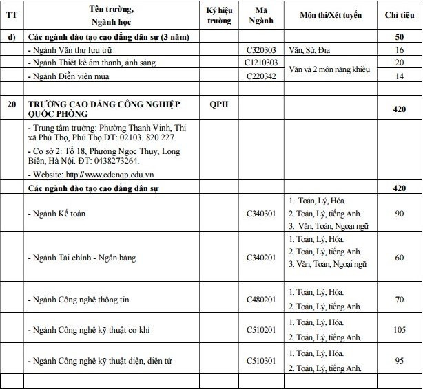 Cao đẳng Công nghiệp Quốc phòng chỉ tuyển sinh hệ dân sự với 420 chỉ tiêu.