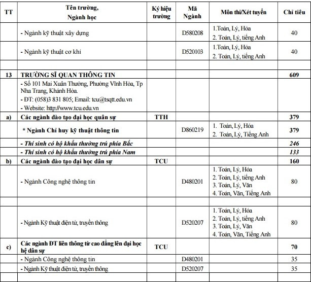 Trường Sĩ quan Thông tin tuyển 379 chỉ tiêu hệ quân sự ngành Chỉ huy Kỹ thuật Thông tin và 160 chỉ tiêu hệ dân sự các ngành Công nghệ Thông tin, Kỹ thuật Điện tử, Truyền thông và 70 chỉ tiêu hệ liên thông dân sự cho hai ngành này.
