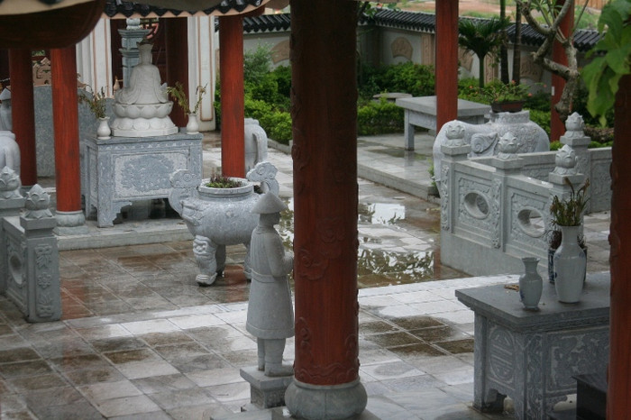 | Trước bàn thờ và hai lăng mộ lớn nhất, là tượng đá hai lính hầu đứng chầu hai bên |