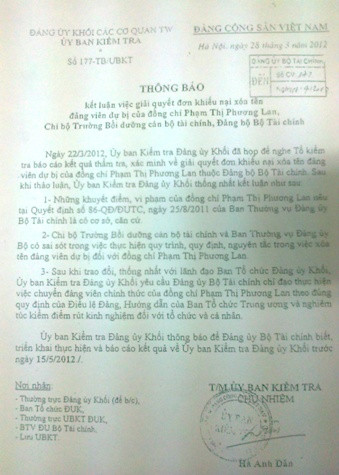 Căn cứ vào kết luận và đề nghị của Tổ kiểm tra, ngày 28/3/2012, Ủy ban Kiểm tra Đảng ủy Khối đã có Thông báo số 177-TB/UBKT kết luận việc giải quyết đơn khiếu nại xóa tên đảng viên dự bị của bà Phạm Thị Phương Lan. Theo Đảng ủy Khối, Chi bộ Trường BDCBTC và Ban Thường vụ Đảng ủy Bộ Tài chính có sai sót trong việc thực hiện quy trình, quy định, nguyên tắc trong việc xóa tên đảng viên dự bị đối với bà Lan; yêu cầu Đảng ủy Bộ Tài chính chỉ đạo thực hiện viện chuyển đảng viên chính thức đối với bà Lan và nghiêm túc rút kinh nghiệm đối với tổ chức, cá nhân.
