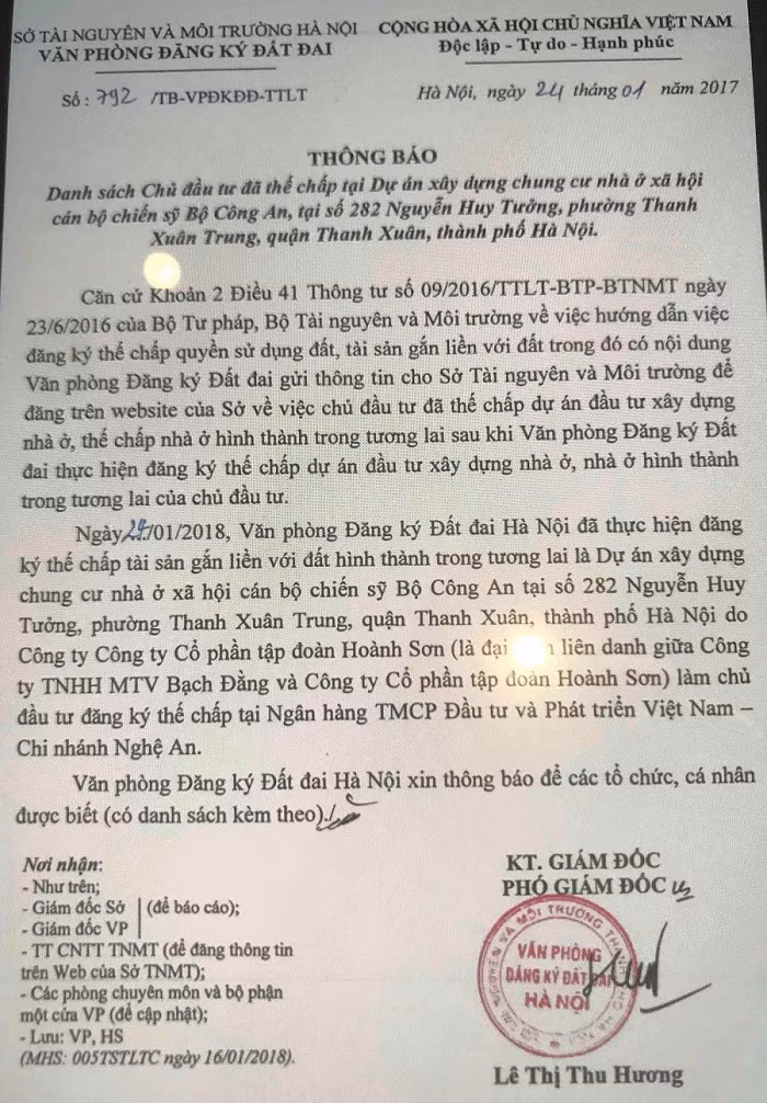 Theo đó, thông báo số 792/TB-VPĐKĐĐ-TTLT ngày 24/1/2018 của Văn phòng đăng ký đất đai, Sở Tài nguyên và Môi trường Hà Nội cho biết, ngày 24/1/2018, Văn phòng này đã thực hiện đăng ký thế chấp tài sản gắn liền với đất hình thành trong tương lai là Dự án xây dựng chung cư nhà ở xã hội cán bộ chiến sĩ Bộ Công an tại số 282 Nguyễn Huy Tưởng, phường Thanh Xuân Trung, quận Thanh Xuân, Thành phố Hà Nội.