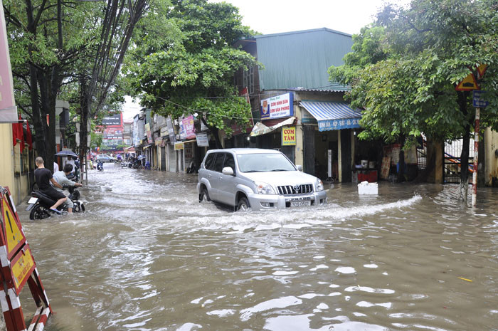| Mưa lớn khiến phố Trần Bình ngập sâu hơn 50 cm. |