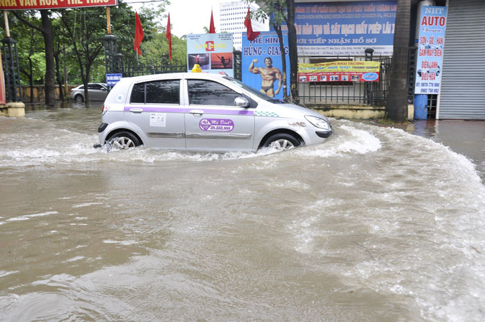 | Nước ngập sâu, các phương tiện dạt hết về một bên và lưu thông rất chậm khi qua các điểm ngập úng. |