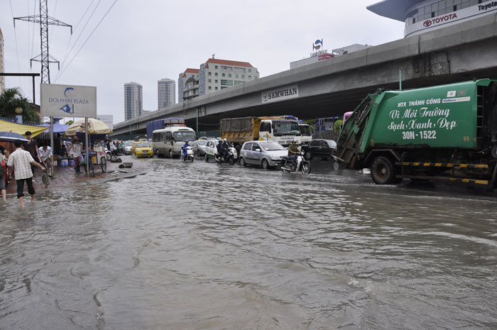 | Trên tuyến đường Phạm Hùng nhiều đoạn cũng ngập úng cục bộ, các phương tiện lưu thông qua đây cũng gặp rất nhiều khó khăn. |