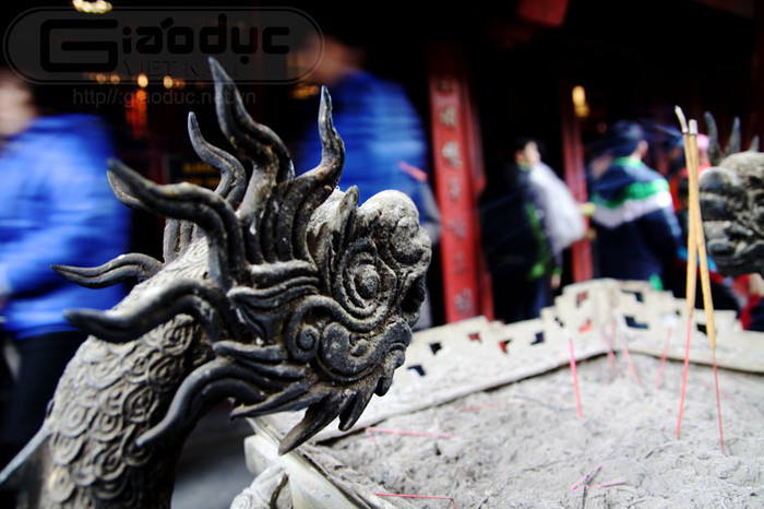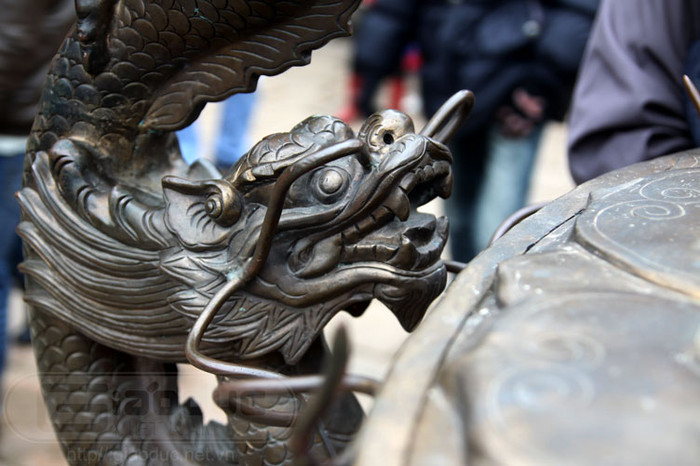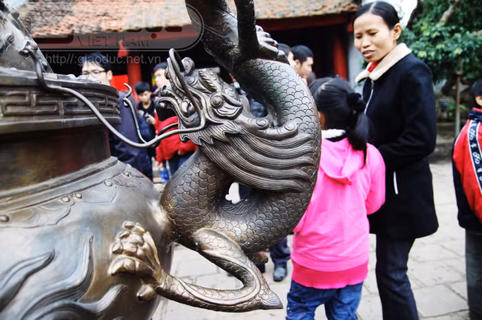 | Khách tới Văn miếu Quốc Tử Giám cầu may, thăm quan ai cũng trầm trồ khen ngợi những đường nét tinh sảo của chiếc đỉnh đồng. |