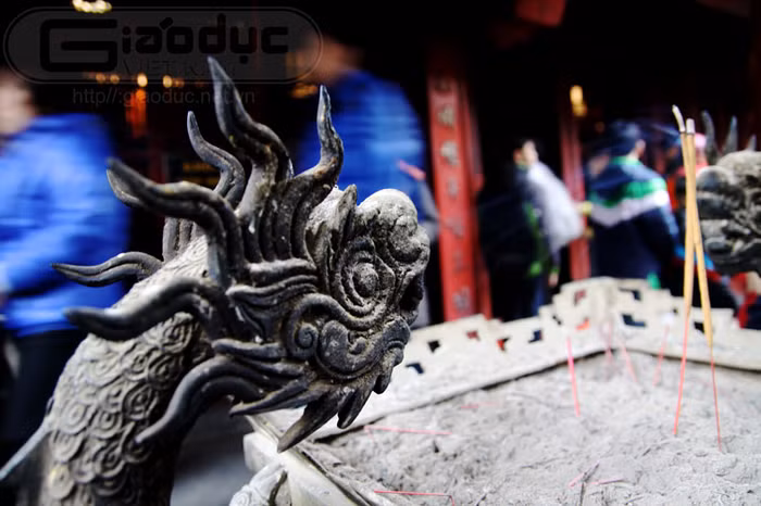 | Ngoài những chú rồng chầu ở chiếc đỉnh đồng được đặt ngoài sân Trình, tại phía trong gian thờ Khổng Tử, chiếc lư hương cũng có hai con rồng chầu hai bên. |