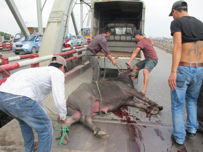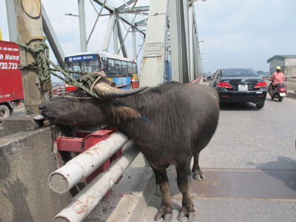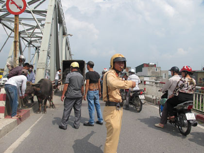 | Khoảng 12h20 trưa 13/10, người dân lưu thông trên cầu Chương Dương hướng từ quận Hoàn Kiếm sang Long Biên đã vô cùng hốt hoảng khi chứng kiến một con trâu mộng lao với tốc độ kinh hồn ngược dòng xe. Sau khi húc vào một người đi máy làm anh này ngã sõng xoài trên đường rồi chạy gần hết cầu, con trâu điên trên đã bị Thượng sỹ Nguyễn Đăng Hậu, Đội CSGT số 5 chạy bộ đuổi theo cùng một số quần chúng nhân dân tích cực dùng thừng buộc ghì chặt vào lan đầu cầu.