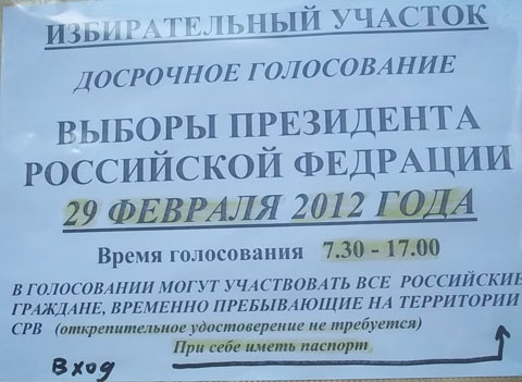 Việc bầu cử tổng thống Nga ở Nha Trang diễn ra từ 7h30' sáng – 17h ngày 29/2, dành cho công dân Nga đang sinh sống và làm việc tại địa phương này. Không khí bầu cử diễn ra trật tự và an toàn.