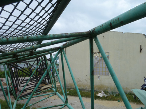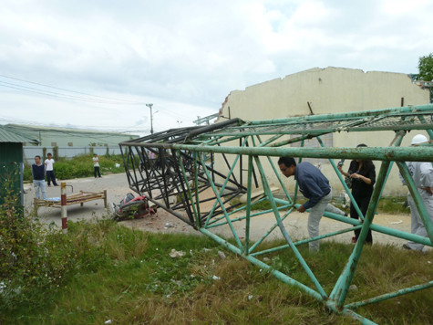 | Toàn bộ phần cần cẩu dài khoảng 30m bị bẽ gãy cong làm 2 đoạn, đập xuống khu lán trại phía Tây đầu cầu làm sập tường khu nhà ở này. |
