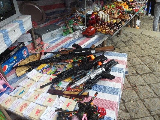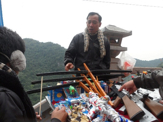 | : Có lẽ không ở đâu tình trạng bày bán và chào mời khách mua các loại đồ chơi bạo lực như tại chùa Hương |