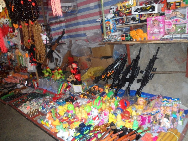 | Ngay phía trước động Hương Tích là hàng loạt các bàn bày bán đồ chơi bạo lực như súng, dao kiếm bằng nhựa. Theo tìm hiểu, mỗi khẩu súng như thế này thường bắn một loại đạn bằng nhựa hình tròn và có tầm bắn rất xa từ 50 - 100 mét. Nếu bị bắn vào mắt hoặc cơ thể người thì có thể dẫn đến mù hoặc tổn thương rất nặng. |