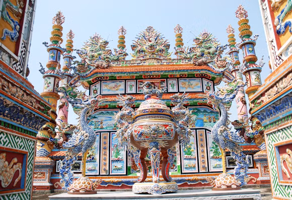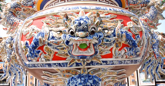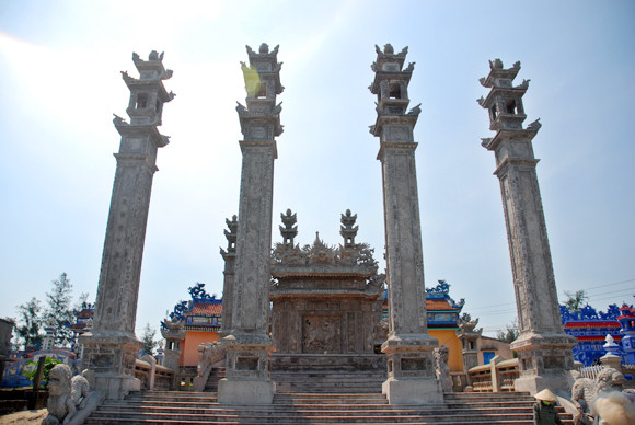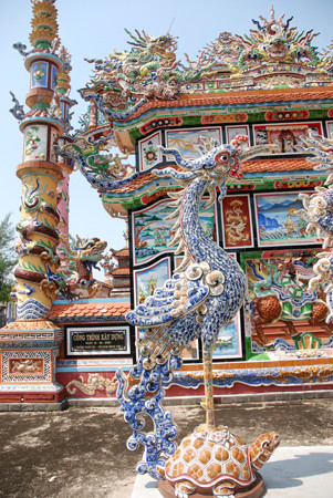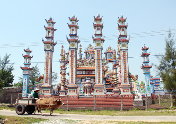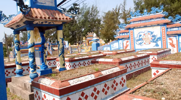 | Bên cạnh quy mô thì sự cầu kỳ trong việc thể hiện các chi tiết cho thấy mức độ "hoành tráng" của mỗi ngôi mộ. Ở đây, các ngôi mộ được ốp sành sứ theo kiến trúc chùa chiền Huế. Sự tinh xảo, tỉ mỉ trong công đoạn ốp sành sứ thể hiện "đẳng cấp" mỗi khu mộ. |