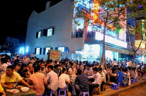 | Sau mỗi giờ tan tầm, đồng nghiệp, bạn bè đều hẹn nhau ra những quán cóc thế này để chén chú chén anh. Không chỉ tại Hà Nội mà đây là tình trạng diễn ra ở hầu hết các tỉnh thành trên cả nước. Trời đã khuya các ông vẫn "ngồi đồng" ở một quán nhậu trên đường Thành Thái, TP HCM. Ảnh: Thi Trân. |