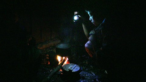 | Hai học trò lớp 3 ở chung một chòi khác cũng chuẩn bị bữa cơm với chiếc đèn pin thông dụng. |