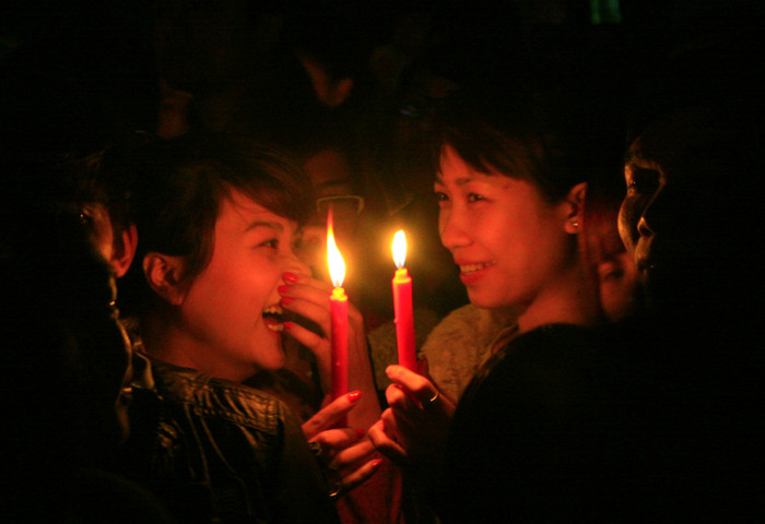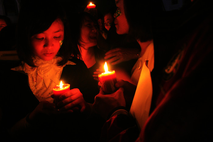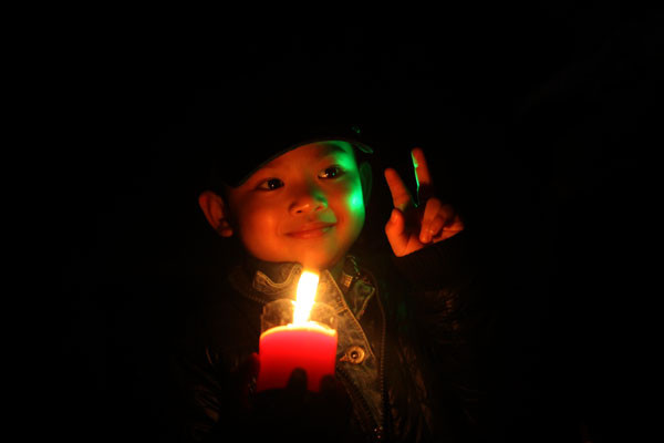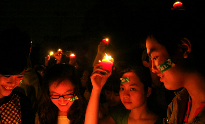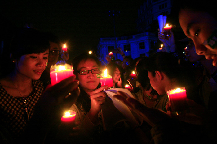 | Họ quây quần bên những ngọn nến được xếp hình con số 60, biểu tượng của 1 giờ đồng hồ nhiều nước trên thế giới tham gia vào chiến dịch bảo vệ môi trường. |