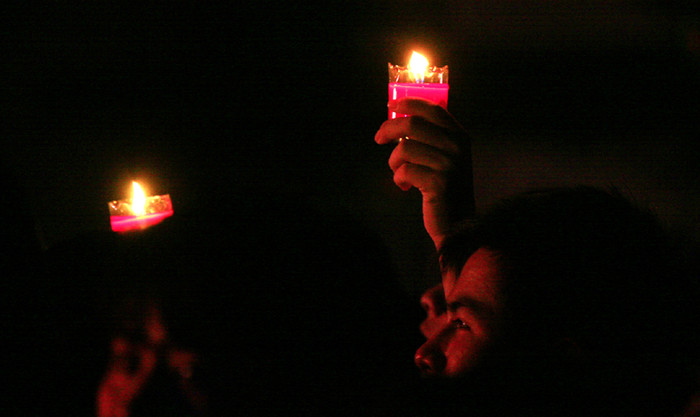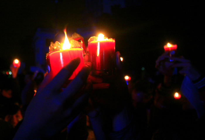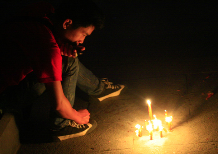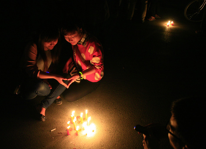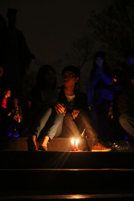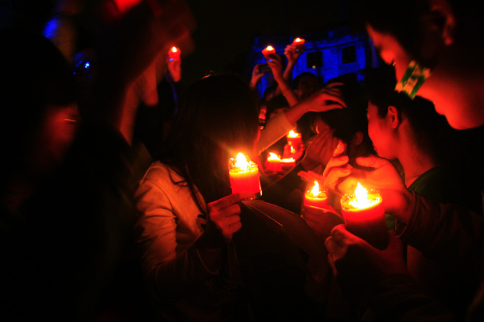 | Tại quảng trường Cách mạng tháng Tám, giới trẻ đổ về hưởng ứng và thắp lên những ngọn nến. |