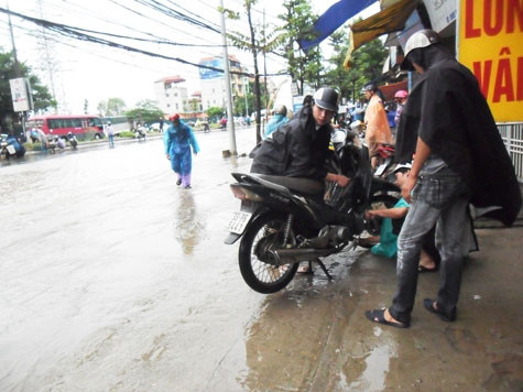 |  Cũng gặp tình trạng xe bị chết máy như cô Yên, chị Thu (Chúc Sơn) cho biết: đường ngập quá xe không thể đi nổi, đi được một đoạn đã bị chết máy, tôi cũng đem vào cho người ta sửa, chỉ dốc hết nước ở bô ra là lại đi ngon. (Ảnh: . Đường bị ngập sâu, nhiều phương tiện lưu thông bị chết máy.)  |