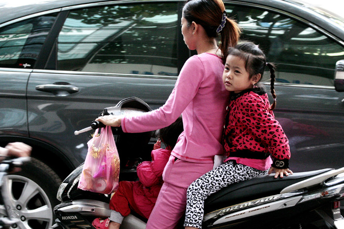 | Rất nhiều bé ở độ tuổi 2 – 5, thậm chí nhỏ hơn, được cha mẹ chở đi học bằng xe máy như thế này |