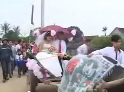 | Trong đoạn video, chú rể vận bộ đồ sơ mi khá giản dị, tự tay dắt chú trâu được phủ một lớp vải với chữ hỉ dán trên lưng kéo đến nhà cô gái để đón dâu. |
