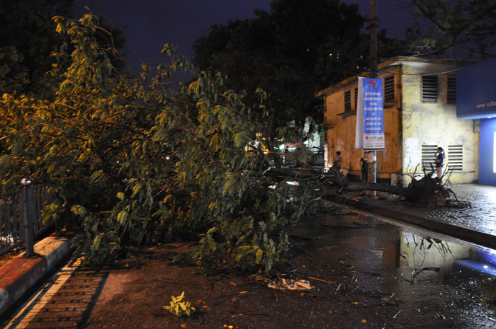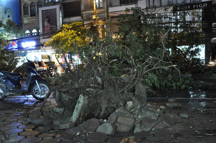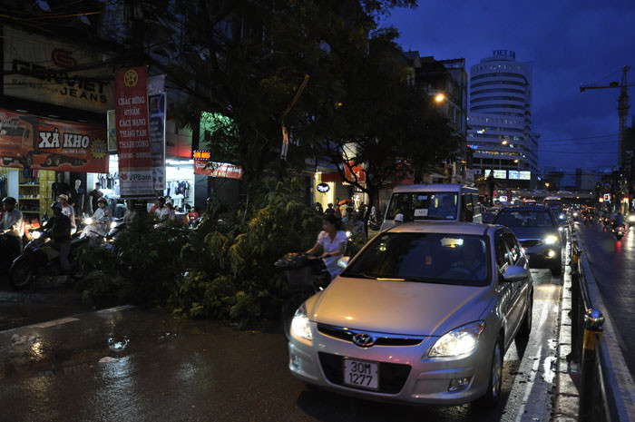 | Tình trạng cây đổ cũng xảy ra nghiêm trọng trên tuyến đường Chùa Bộc. |