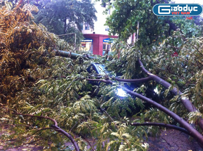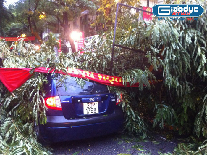 | Những cành cây lớn bị gãy, đè lên làm hư hỏng một ôtô và khiến người lái xe bị thương. |