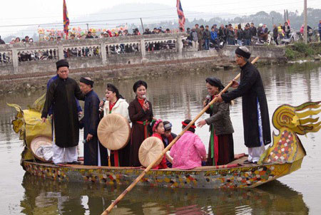 | Liền anh, liền chị cùng trao nhau những câu hát nặng nghĩa, nặng tình trên thuyền. |