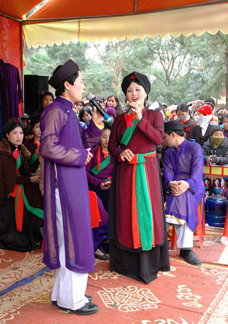 | Trong bộ áo the, khăn xếp, áo tứ thân, "mớ ba", "mớ bảy" các liền anh, liền chị đã trao cho nhau những câu hát nặng tình, nặng nghĩa. |