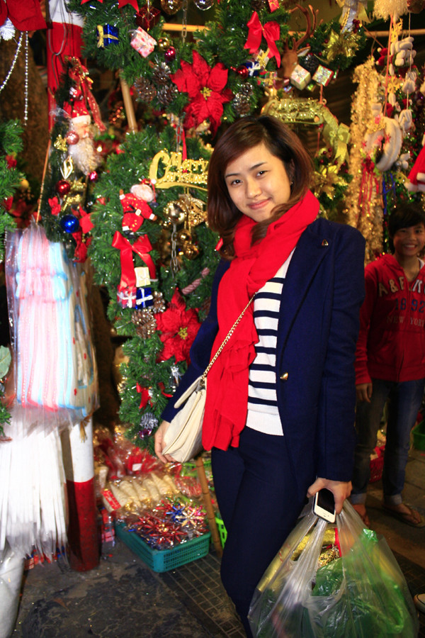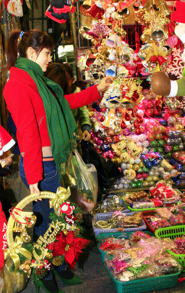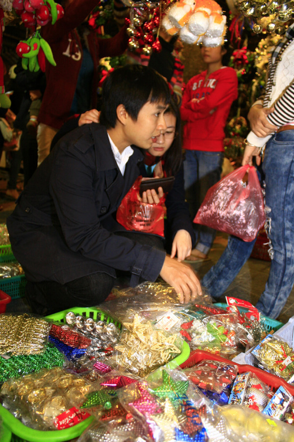 | Màu đỏ của những bộ đồ Noel, tất, mũ Noel, các hình ông già Tuyết, quả cầu, quả châu trang trí hay màu xanh, màu bạc của những cây thông Noel, quả chuông, dây kim tuyến…là những sắc màu của những con phố quà tặng nổi tiếng Hà Nội những ngày này. |