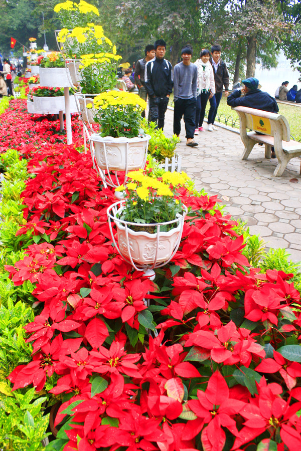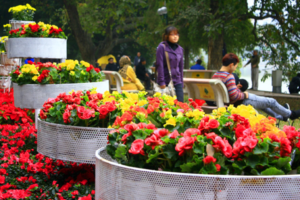 | Nhiều khách tham quan sớm tại khu phố Hoa ven Hồ Gươm vì vào ngày khai mạc chắc chắn sẽ khó có thể chen chân |